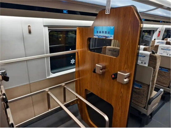 此次试点选取G7831/2、G7833/4、G7835/6、G7837/8次共8趟列车,对二等座车厢部分座椅进行适应性改造,增设专门的“雪具存放处”。旅客选择该服务后,可携带长、宽、高之和不超过200厘米的雪具同车出行,远超普通行李尺寸限制;对于超过200厘米的超规雪具,仍可通过托运方式运输。